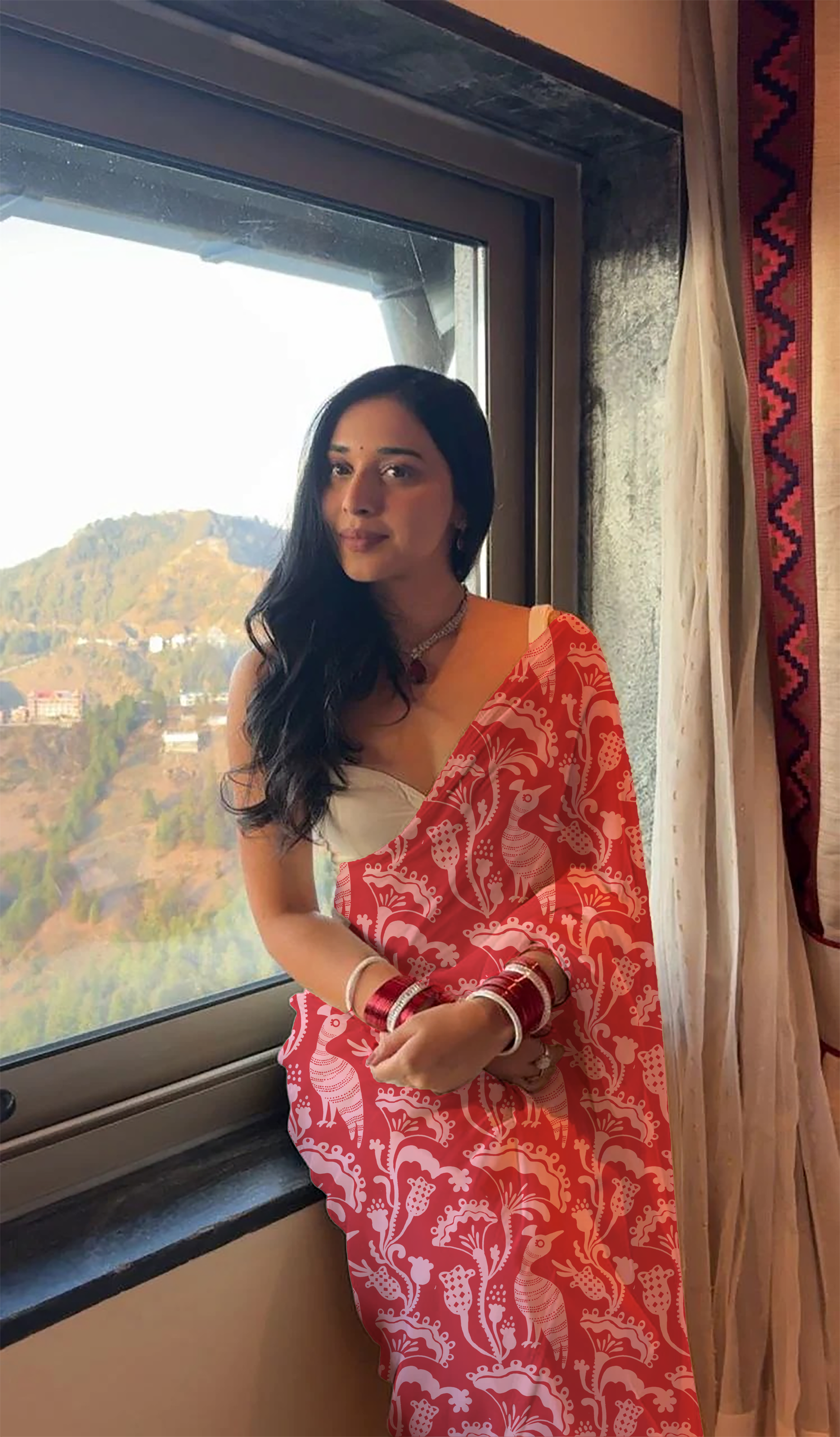 Meet Feza, named after the open sky, is your ticket to floaty, feel-good days. Covered in cheerful little birds and crafted in soft, breathable mul cotton, this saree is light as air and made for movement. Wear it to work, brunch, or just because. Feza’s here for the soft landings and high vibes.